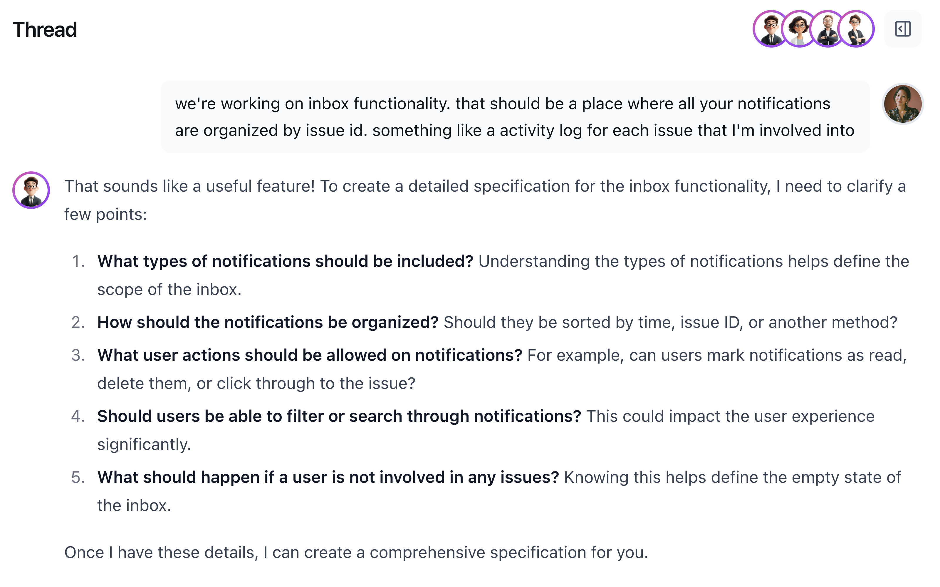 Pull AI agents into any conversation. They ask clarifying questions, generate detailed specs, and collaborate with you in real-time—just like chatting with a colleague.