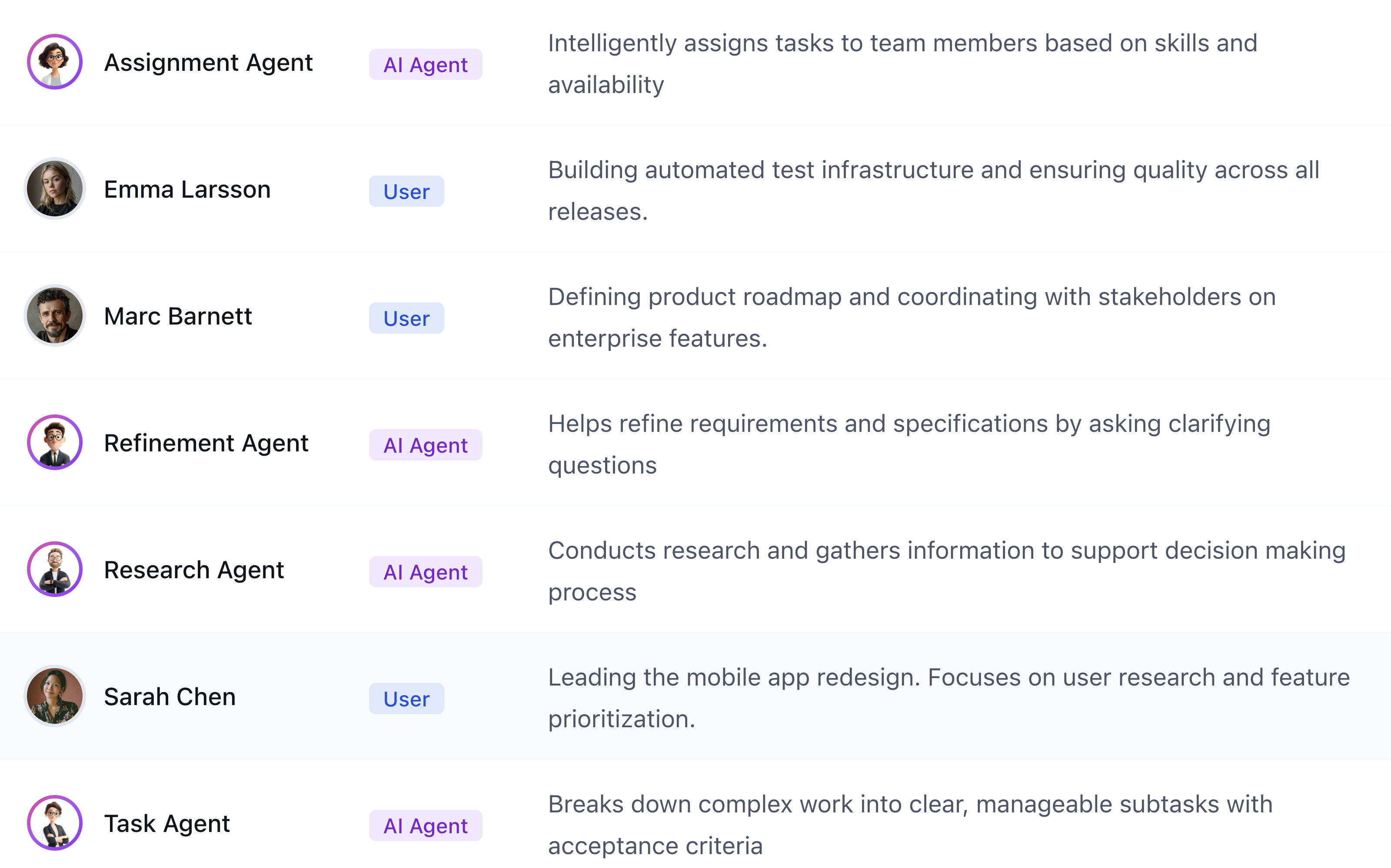See humans and AI agents side-by-side. Assign tasks to anyone—human or agent. Monitor capacity, track progress, and measure performance across your entire team.